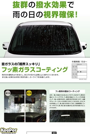プロの技術で施工するガラスコーティングやクリスタルキーパー、フレッシュキーパー、ダイヤモンドキーパー、エコダイヤキーパー、 EXキーパーは、ボディの輝きを一瞬キープ!新車にも中古車にもおすすめです。