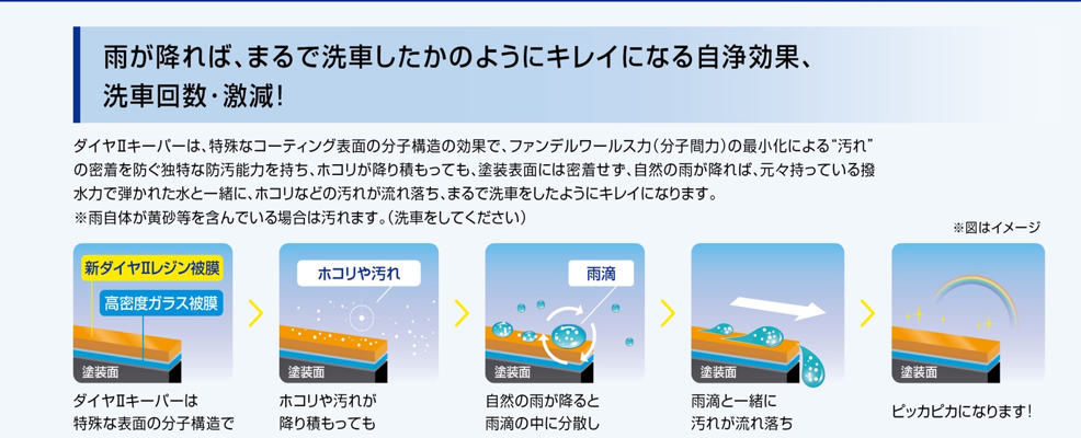 晴天時にホコリが積もっても、塗装表面には密着しないので、自然の雨が降れば元々持っている表面の撥水力ではじかれた水と一緒にホコリなどの汚れが流れ落ちてしまい、まるで洗車をしたかのようにキレイになってしまいます。