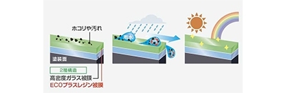 ECOプラス ダイヤモンドキーパーは、特殊なコーティング表面の分子構造の効果で、ファンデルワールス力(分子間力)による"汚れ"の密着を防ぐ独特な防汚能力を持ち、 ホコリが降り積もっても、塗装表面には密着せず、自然の雨が降れば、元々持っている撥水力で弾かれた水と一緒に、ホコリなどの汚れが流れ落ち、まるで洗車をしたようにキレイになります。
