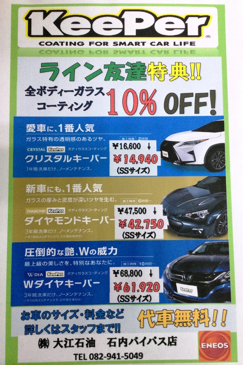 (洗車機+艶パック)SSサイズ⇒ ¥7,400 Sサイズ⇒ ¥7,800 Mサイズ⇒ ¥8,400