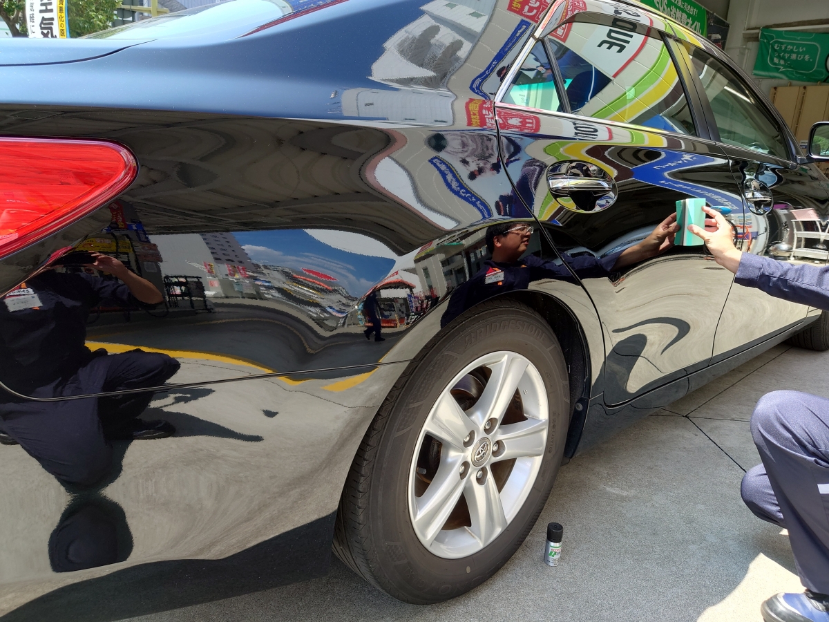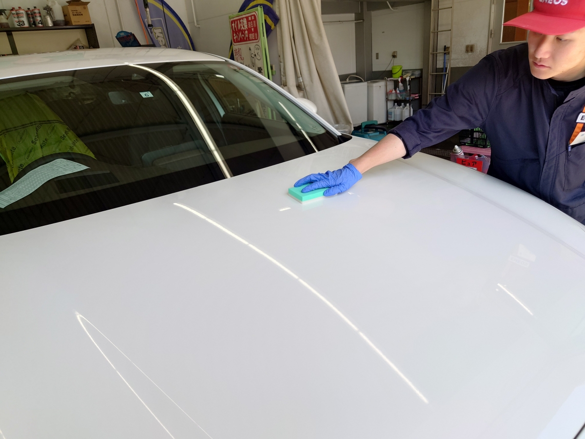 適切な状態で施工するため、コーティング前に塗装表面を削ることのない限度でほとんど塗装表面の傷を消しています。