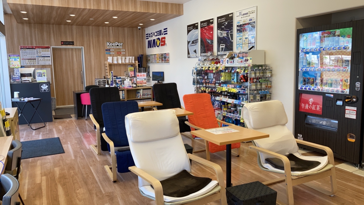洗車やコーティング施工中の作業待ちの間は店内でごゆっくとお待ちいただけます。