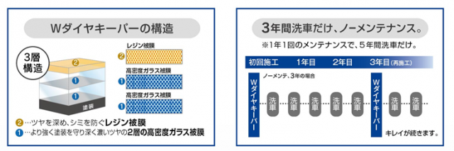【ガラス、ガラス、レジン】の3層構造でダイヤモンドキーパーの厚いガラス層が2倍あり、更なるツヤとより強く守る防護能力を形成するのがダブルダイヤモンドキーパー。