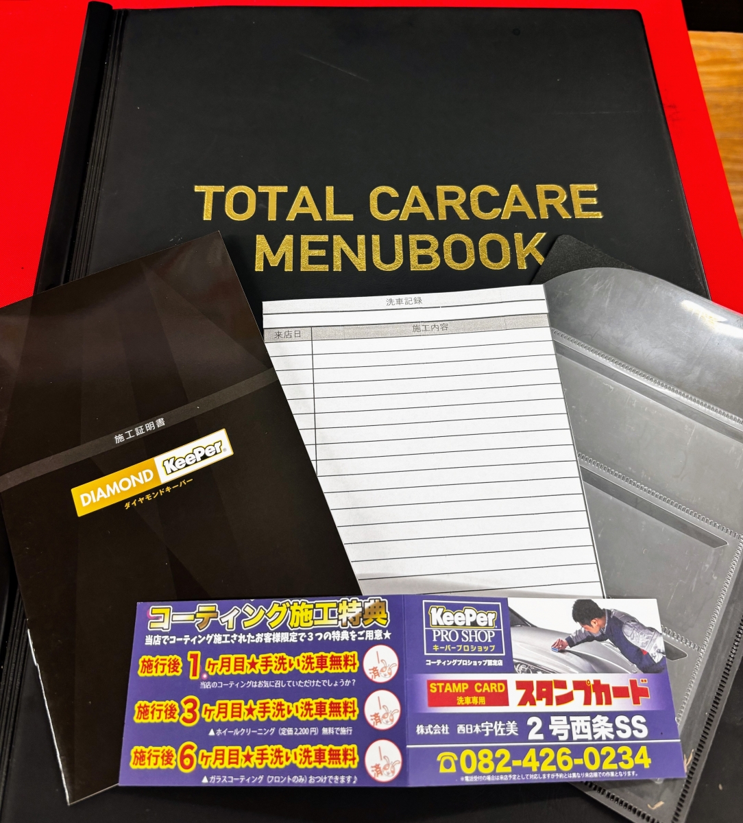 当店施工特典として3回無料手洗い洗車券(青色のカード)をプレゼントしております。