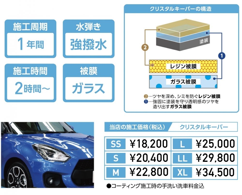 - 冷暖房付き2台分の『密閉型』コーティングブースを完備し直射日光を遮断し、雨、風、ホコリなどに