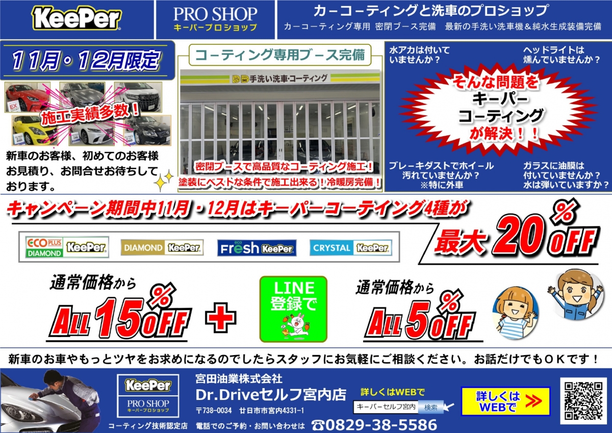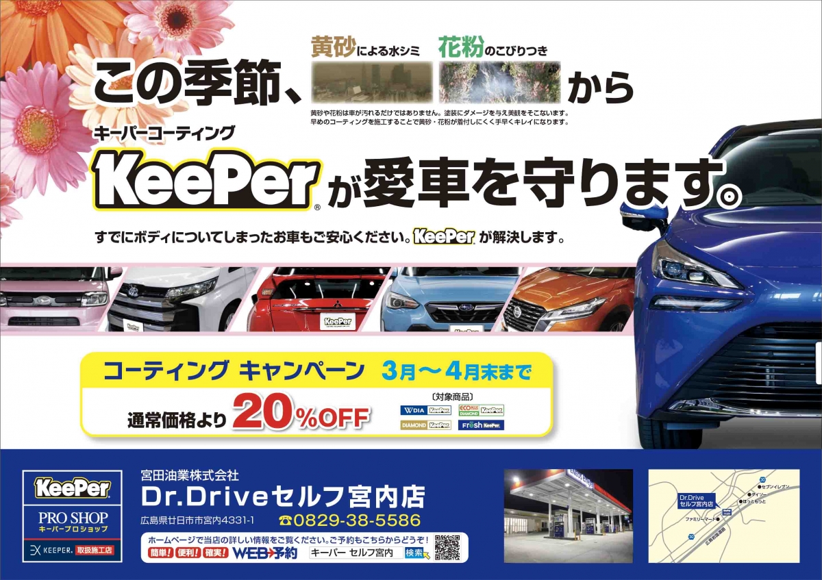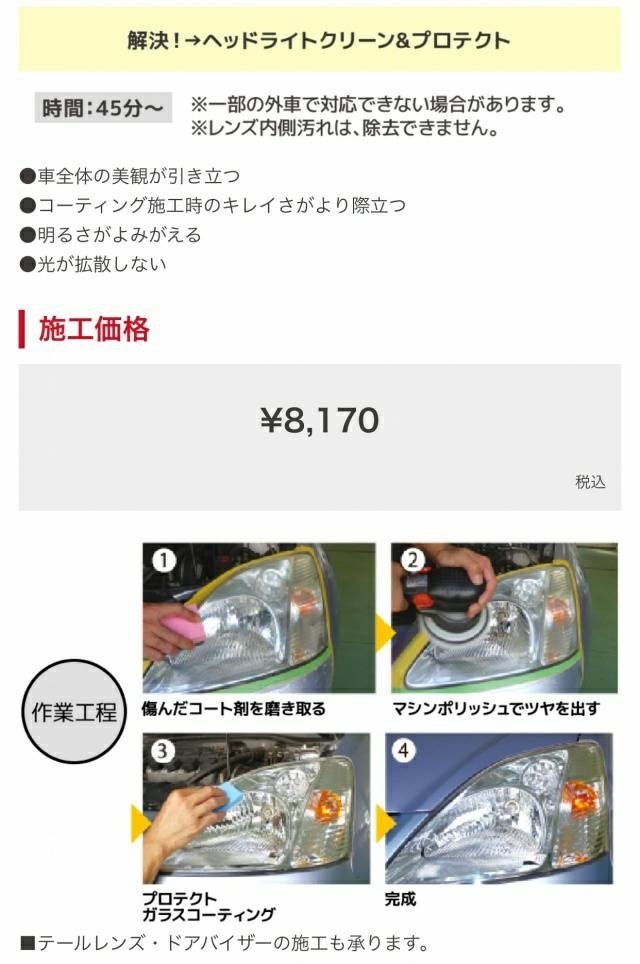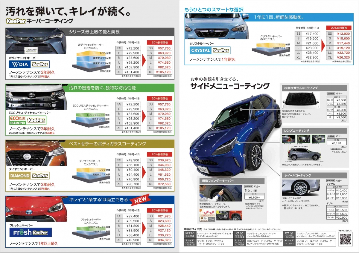 - 冷暖房付き2台分の『密閉型』コーティングブースを完備し直射日光を遮断し、雨、風、ホコリなどに