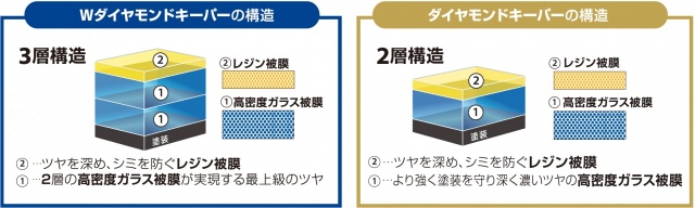 【ガラス、レジン】の2層構造で深いツヤや、酸性雨・紫外線に対する防護能力を持つダイヤモンドキーパーに対して、