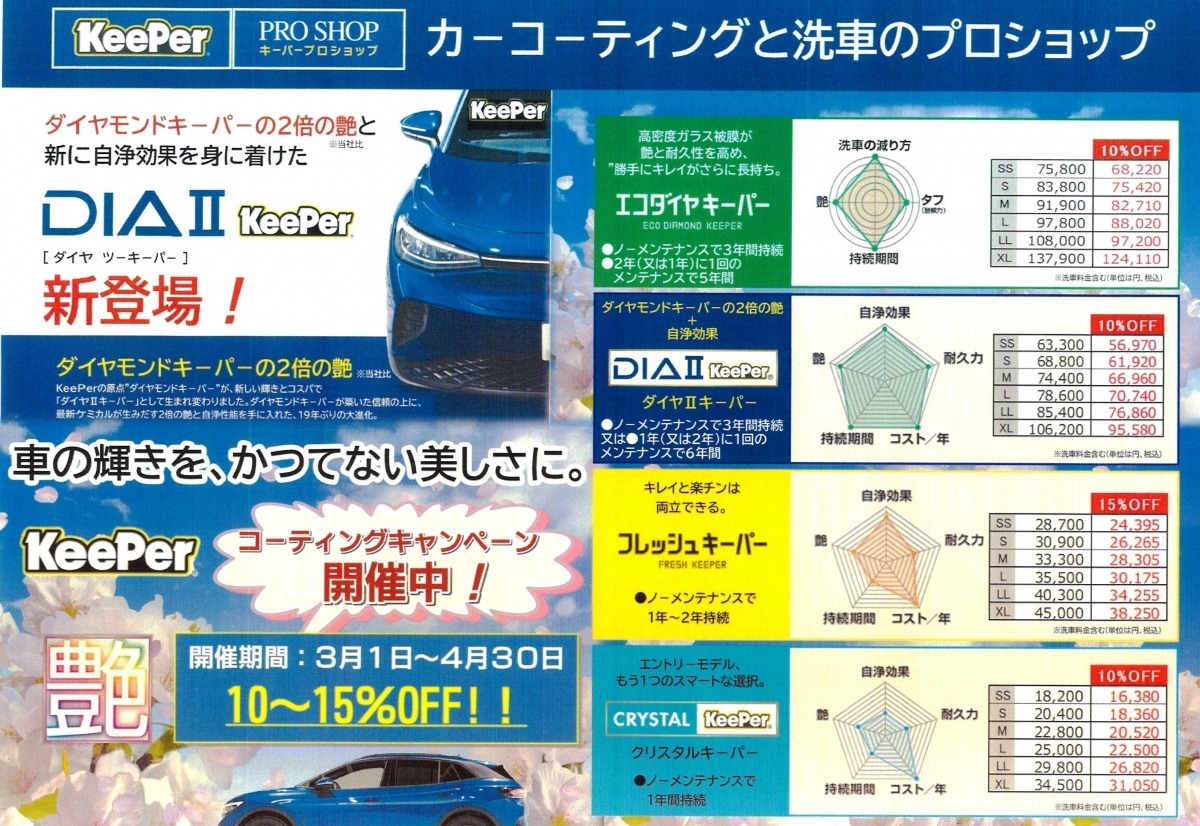 キーパープロショップ株式会社TAISEI DDセルフ熊野SSよりお得なお知らせ! 3月~4月末迄のコーティングキャンペーン!! 対象のコーティングが10%~15%割引きに! 新商品DIAⅡも割引に! ご予約をお待ちしております!