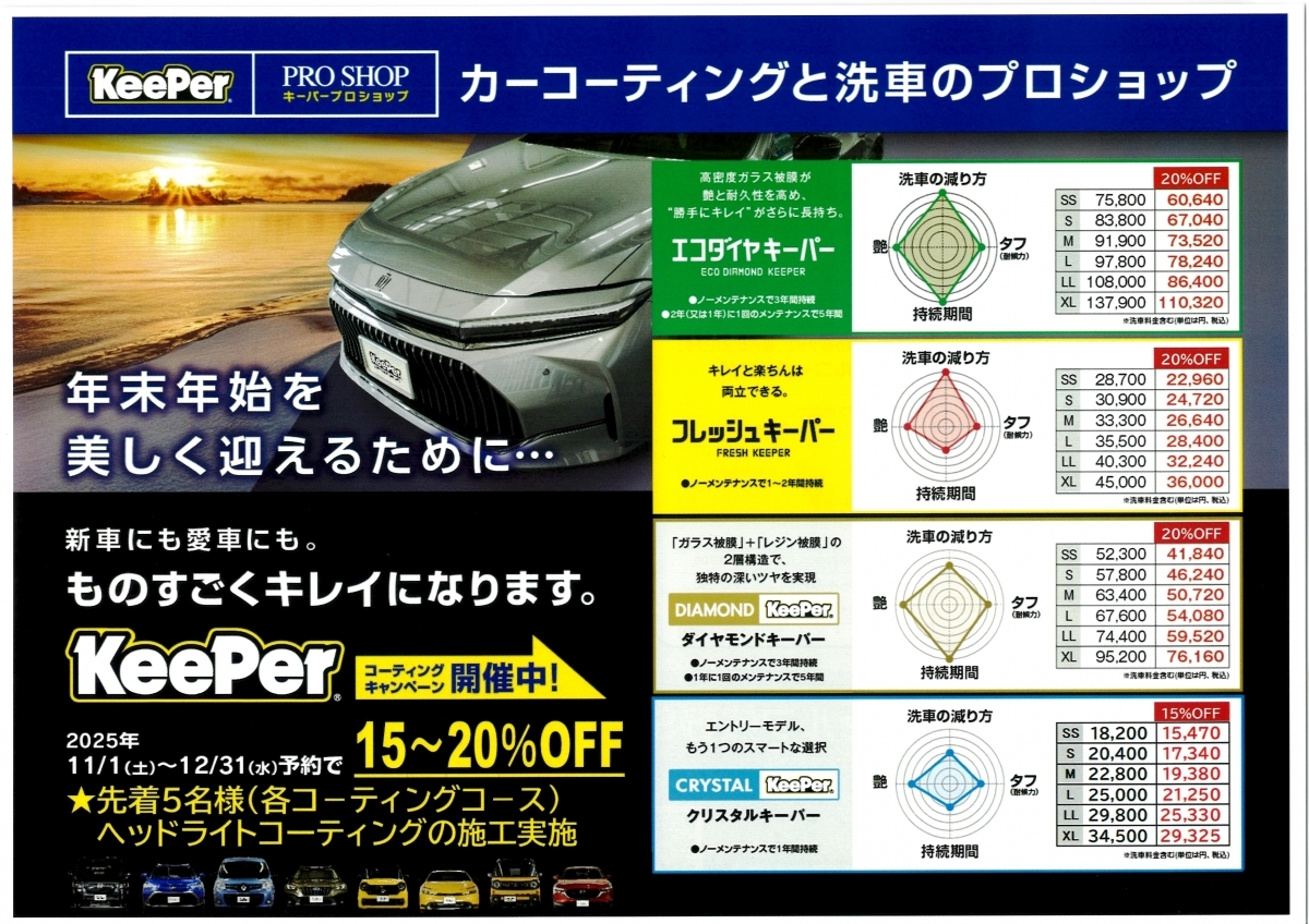 年末コーティングキャンペーンのお知らせ! 11月12月のご予約施工で、15%から20%割引! オプションメニューも更にお得に! この機会に是非、お問い合わせお待ちしております。