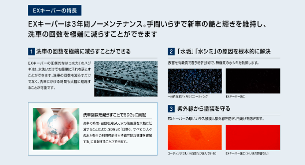 性能A+ランク ECOプラスダイヤモンドキーパー同様、雨で汚れが落ちる独特な防汚能力!施工時間も当日引渡し可能なのでお車を預けてお買い物もOK!青空駐車のお車にうれしいメニューです!