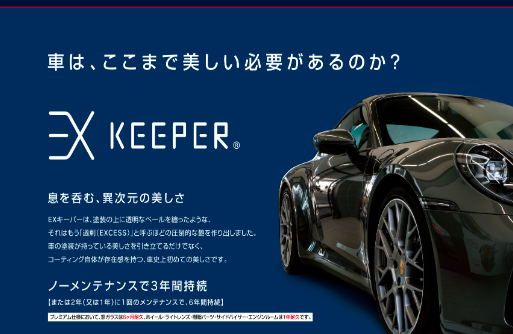 ★耐久力 6年間(2年又は1年に1回メンテナンス実施の場合) or 3年間(ノーメンテナンスな場合) ★艶 車はここまでキレイである必要があるのだろうか? どこまでも吸い込まれるような底なしの深いツヤ ★性能 KeePerコーティング史上最高の商品です 強い耐久力は当然!圧巻といえる深い輝きはEXKeePerだけの 分厚いコーティング膜と特別な訓練を受けたものだけが持つ清廉された技術の結晶。 どこまでも限りなく降り積もる車への想いを私たちにお任せください!
