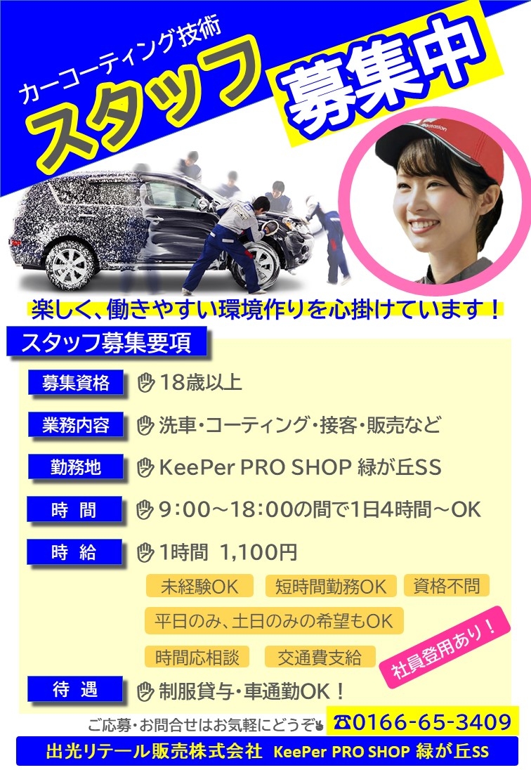 ★自己紹介 ・休日のたびに自分のと家族の車を洗うほど洗車が好きです!キーパーについて日々勉強していて、お客様の使用状況に合わせて的確に提案できるように頑張りますのでキーパーについて聞きたいことがあればぜひご相談ください!
