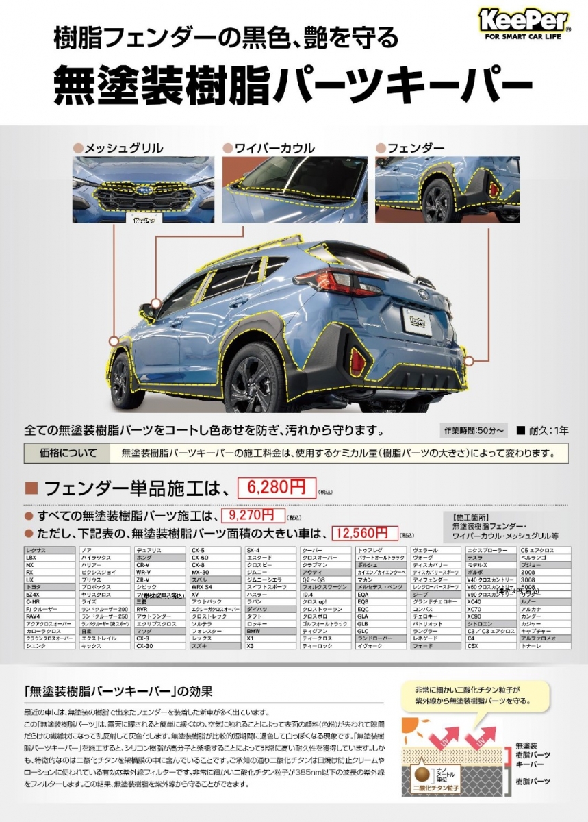 無塗装樹脂パーツをコートし紫外線や色あせを防ぎ、汚れから守ります!!