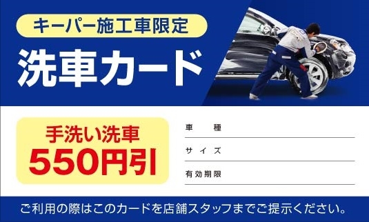 2024年3月からキーパープロショップ浪花町店では当店でコーティングして頂いたお客様に洗車割引カードをお配りしています!車種・サイズに関係なく、手洗い洗車は550円引きと大変お得な特典となっています!