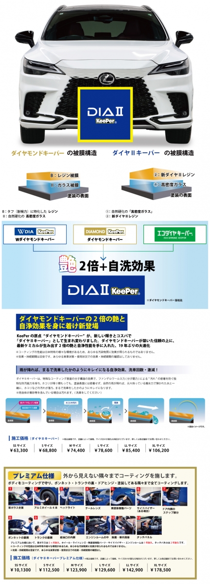また、施工時間には被膜の硬化時間も含まれますのでお帰りの際に雨が当たっても品質には全く影響しません。キーパーコーティングの撥水効果を実感できる絶好の機会をお楽しみください。
