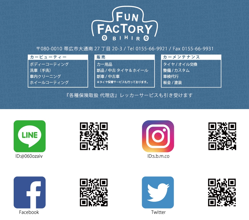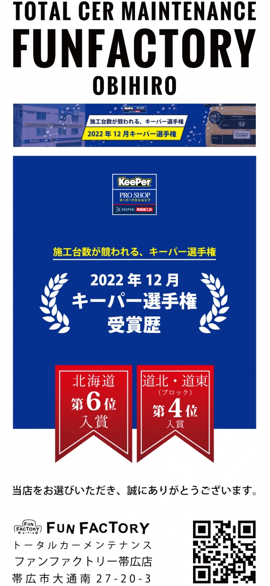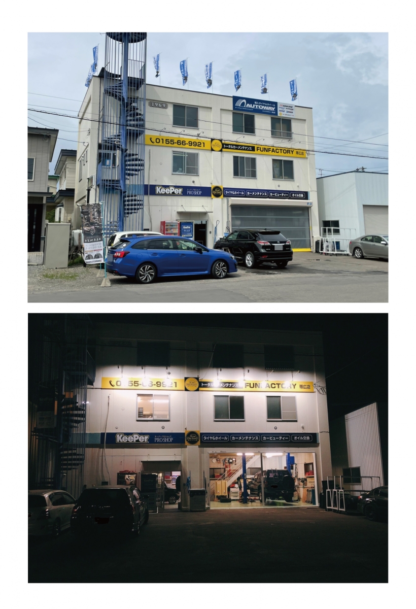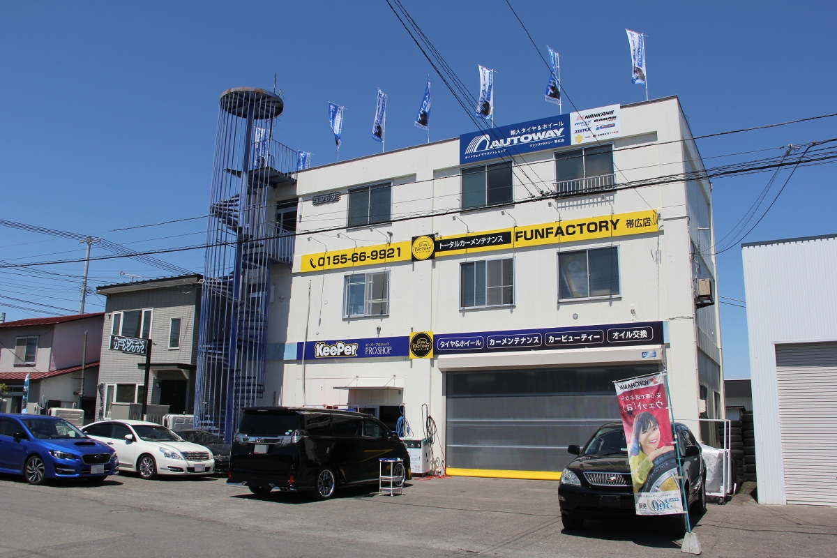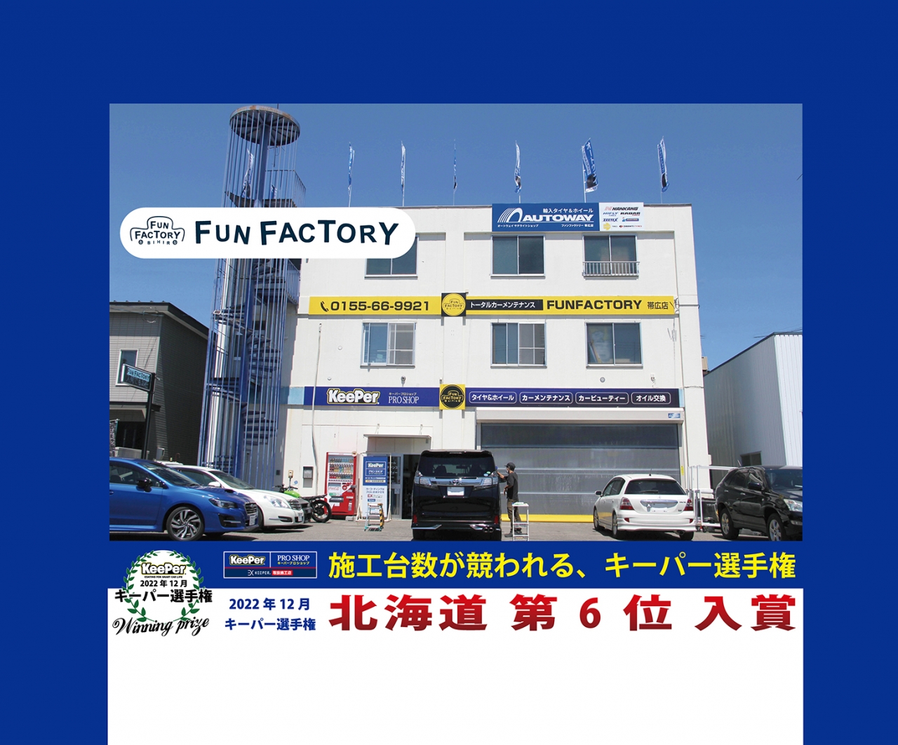 当店は北海道帯広市にある、トータルカーメンテナンス ファンファクトリー帯広店はボディーコーティングと洗車の”キーパープロショップ技術認定店”でもあり、”タイヤのプロショップ”としても事業展開をしています。