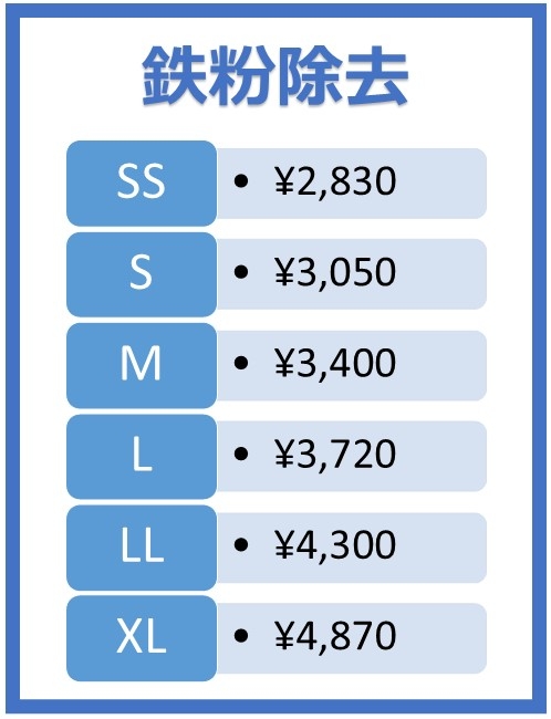 当店では表面積に応じたサイズ表で価格を決定しております。