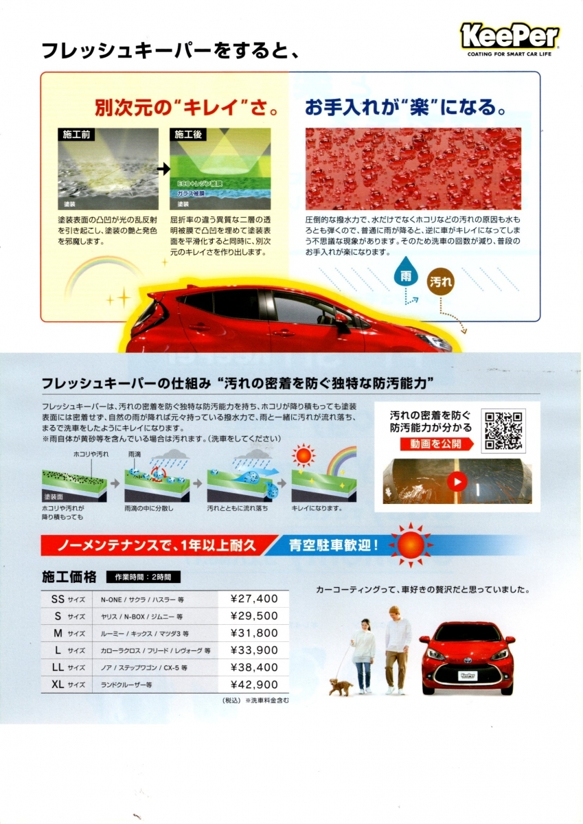 当店のページをご覧いただきありがとうございます!! こちらのフレッシュキーパーは「雨が降ると洗車したかのようにきれいになる!」のが特徴です! 研磨をしていないのにボディがツルツルになり、誰が触ってもわかる違い!どんな車でツルツルになります! 洗車にかける時間・洗車にかけるお金が削減出来てECOになりますよ!! ぜひ当店にお任せください!!