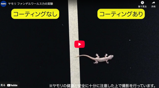 ヤモリは、家の外壁や天井にひっつき歩いていますが、それができるのはヤモリの手足にある独特の構造がファンデルワールス力による吸着力を強くしているからだそうです。ダイヤIIキーパーは、特殊な表面の分子構造の効果で「ファンデルワールス力」による汚れの密着を防ぐ特殊な防汚力を持っています。そんなヤモリが、ダイヤIIキーパーを施工したクルマの塗装表面を歩いたら…