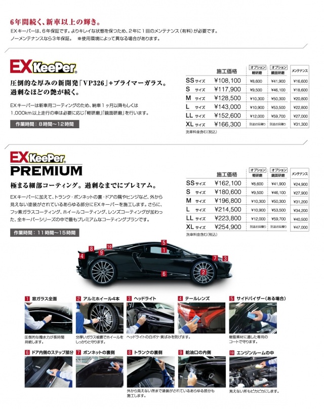 新車にはもちろん、経年車もキレイになるコーティング。ダイヤモンドキーパー。コーティングに大事な下処理にポリッシャーを使い軽研磨をしボディにツヤを出します。その上にクリスタルキーパーよりも厚いガラス皮膜を作ります。仕上がりのツヤが違います。「新車だから」や「まだまだ乗りたいから」「普段全然手入れ出来てないから」などのお客様に多くの施工をさせていただいています。