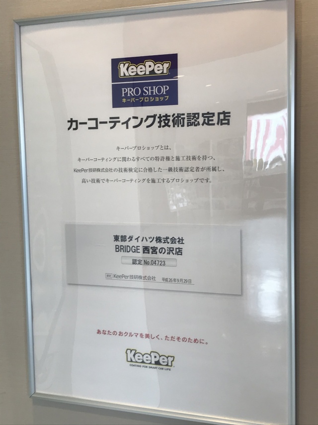 ブリッジ西宮の沢店はKeePer技研(株)が主催するコーティング施工技術の独自検定制度「コーティング技術認定1級資格」を取得したスタッフが在籍する「KeePer PROSHOP(キーパープロショップ)一定の施工環境と商品知識をクリアしているカーコーティングのプロショップです。