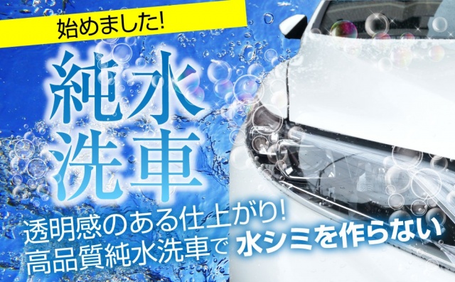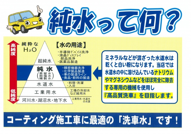 - 純水を使用した手洗い洗車を始めました。純水は医療用の『精製水』としても使われているそうです。純水を洗う前と仕上げに使うとボディ?の発色と透明感が違います。是非一度お試しください。