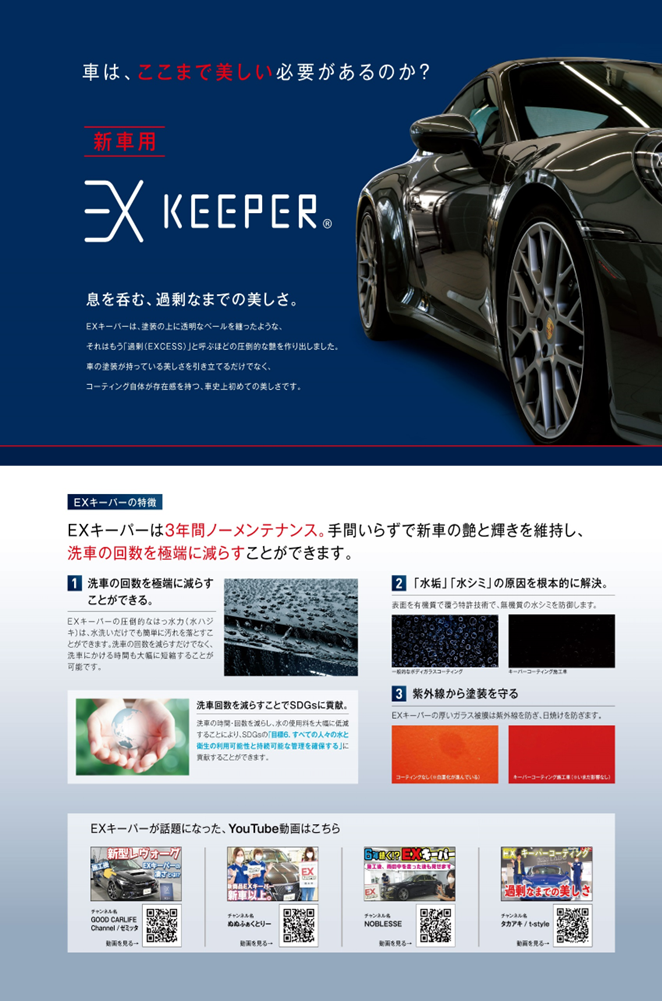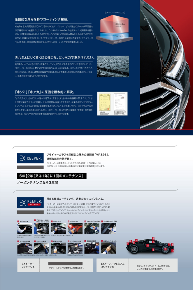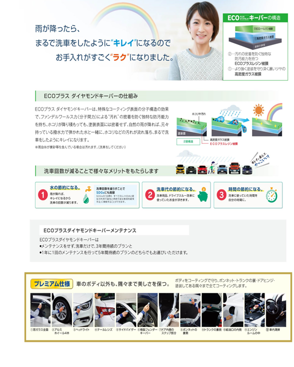 ダイヤモンドキーパーは、厚いガラスの層が防汚能力も強化された被膜を形成して、汚れを弾くだけではなく、酸性雨や紫外線から塗装を守ってくれます。 施工の下地作りの中で、軽研磨の工程が入るので新車だけではなく、もっと長く大事に乗りたいという方にもお勧めできるボディーガラスコーティングです! 洗車だけで3年間塗装を守り、高いレベルのキレイが続きます。