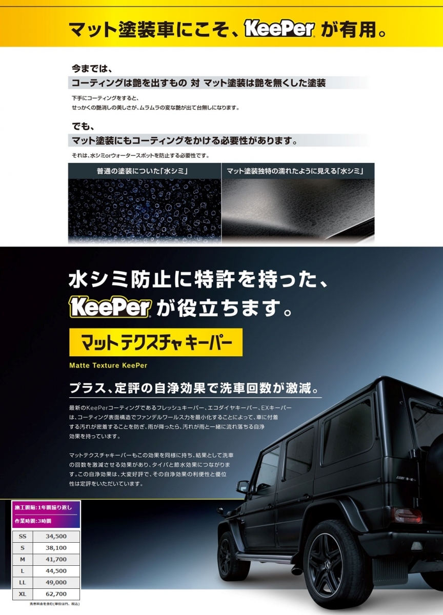ボディガラスコーティングはEXキーパー、エコダイヤキーパー、フレッシュキーパー そして定番のWダイヤモンドキーパー、ダイヤモンドキーパー、クリスタルキーパー、最新のマットテクスチャキーパーをラインナップ。