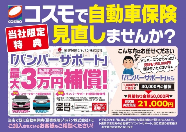 洗車・コーティング施工のお客様は、コスモ石油ならではの「バンパーサポート」の付帯が可能となります!
