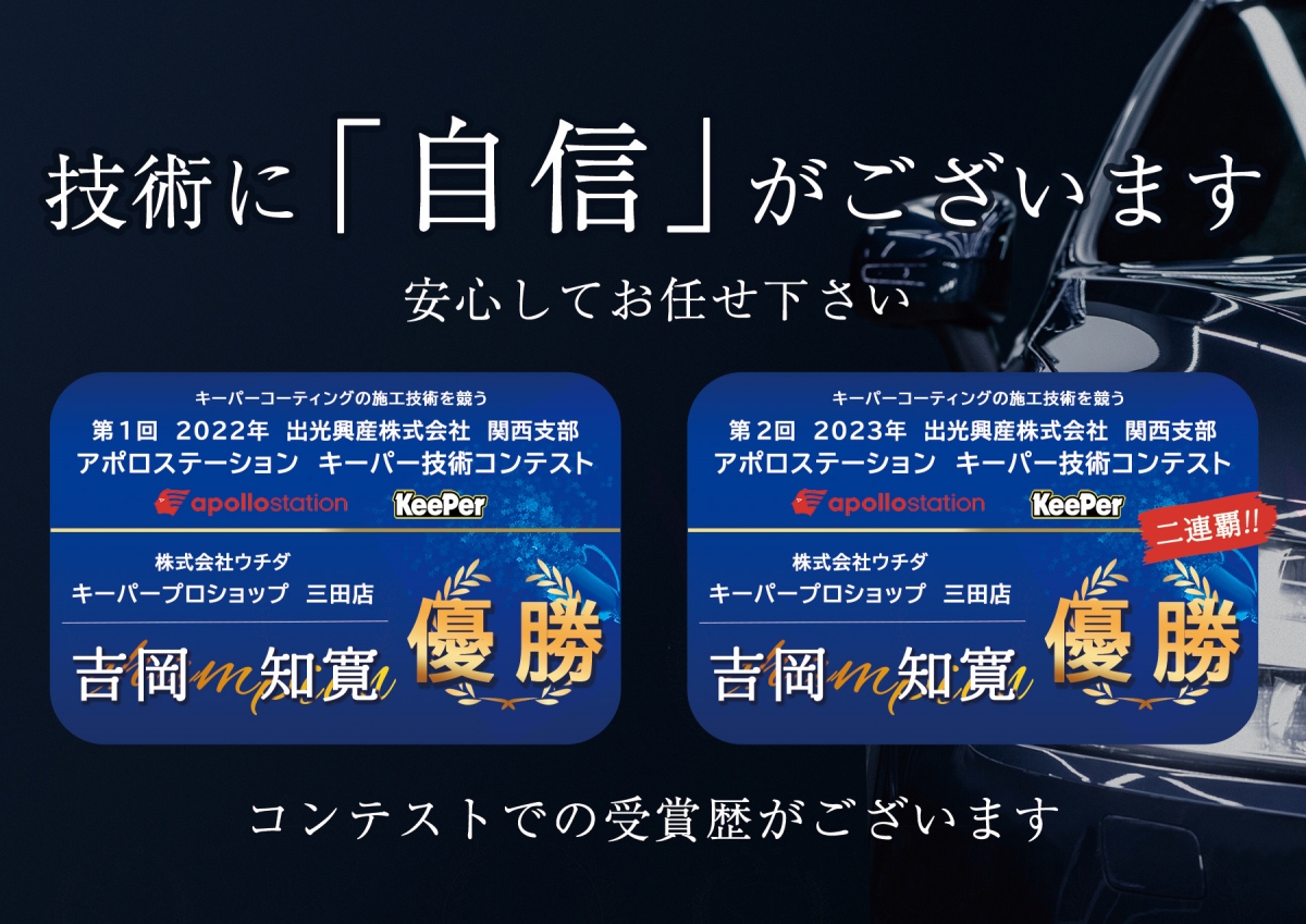 お車のキレイは、コーティング技術1級資格者が1名のカーコーティングと洗車の専門店へお任せください