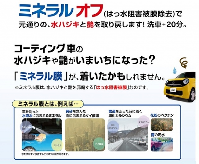 すでにあるコーティングはそのままにコーティング被膜の上に着いたミネラル膜だけを除去することで、コーティング本来のツヤと水弾きが戻ってきます。
