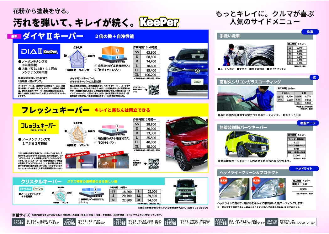 "キレイ"と"楽する"は両立できる、新コーティングが新発売となりました。 発売開始からお問い合わせ、ご予約をたくさんいただいている話題のコーティングメニューとなっています。特殊な防汚能力で"雨が降れば、まるで洗車をしたようにキレイになる"。ノーメンテナンスで1年以上の耐久性、しかも施工価格は28.700円からとリーズナブル。 ぜひ皆様も話題の新コーティング「フレッシュキーパー」をご検討下さい!