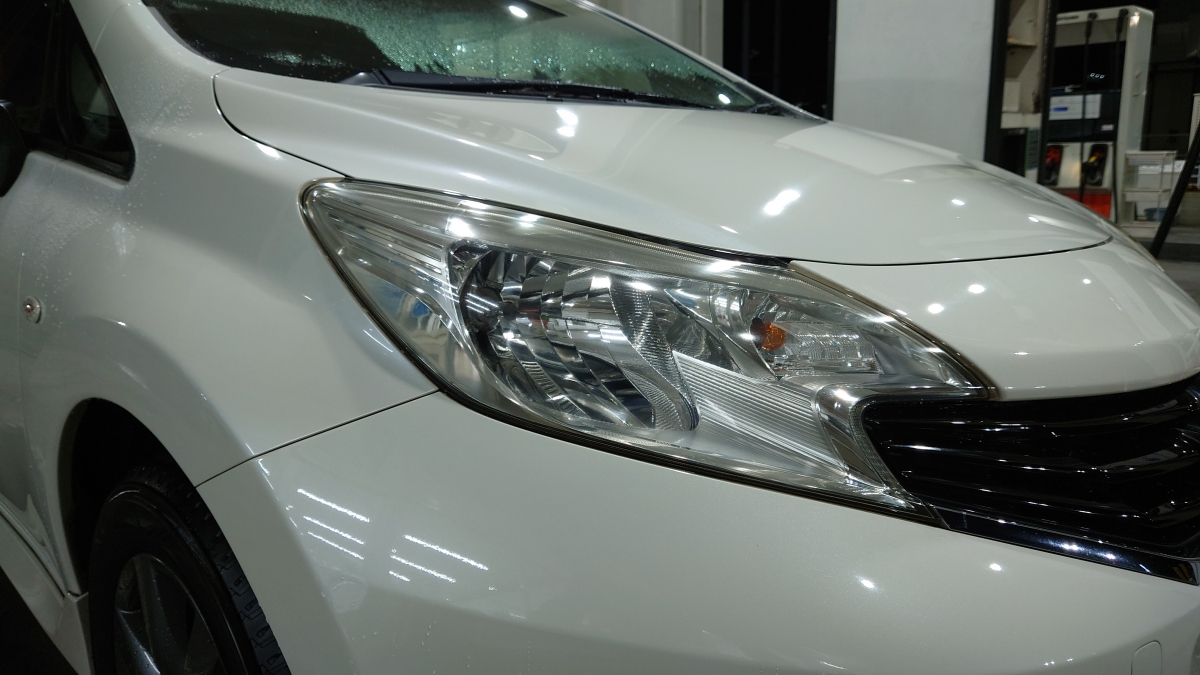 新 車からある程度の年月が経つと、 ヘッドライトの透明カバーの表面が白く濁ったり、黄ばんだりします。 これはポリカーボネイト製のカバー表面に塗ってある水性ハードコートが、 紫外線や熱で劣化したものです。 劣化したハードコートをキレイに取り去って、 無機質の強いガラスコートに入れ替えて透明度の高い新品の状態に戻します。 市販品のようにまたすぐ白く濁ったり、黄ばみが戻ってしまうことがありません。 少なくとも三年は透明状態が確保できます。