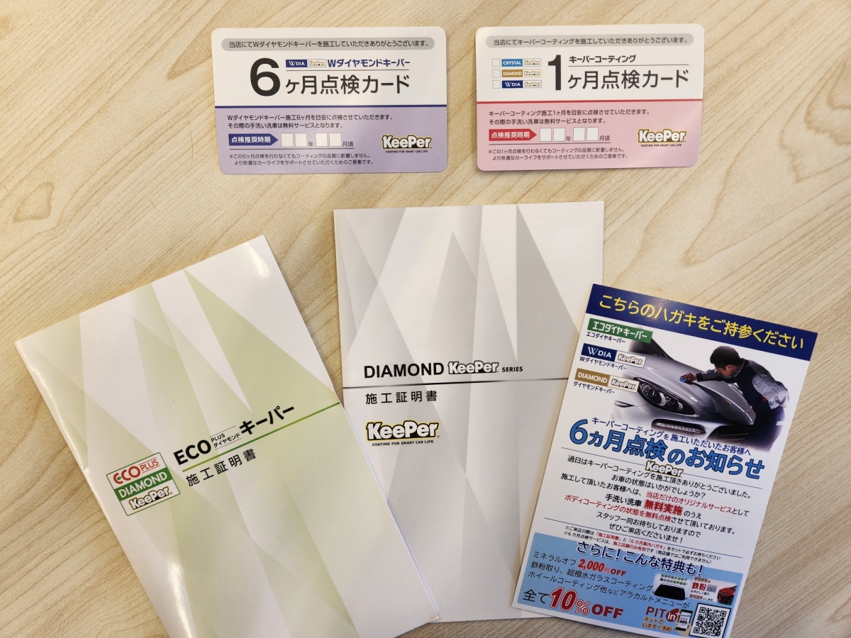 実際に施工した際のお車の状態や、今後のメンテナンスの期間が一目で分かるようになっており、また、コーティングしていただいたお客様へ、当店よりコーティング時期や、点検時のご案内もさせていただいておりますので、いつでもキレイな状態が保てます。