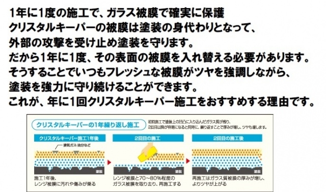 透き通るガラス被膜で1年に1回、新車に戻る。 クリスタルキーパー