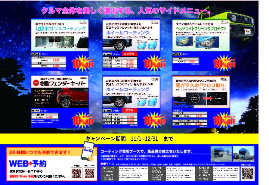各コーティングメニューが割引き価格で施工出来ます!! 最大10%OFF!!