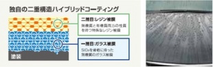 2層目の特殊な「(2)レジン被膜」は無機質のガラス被膜の上に密着することが出来、しかもその密着面の反対側にあたる表面には有機質の性質を持つ特殊なレジン被膜です。