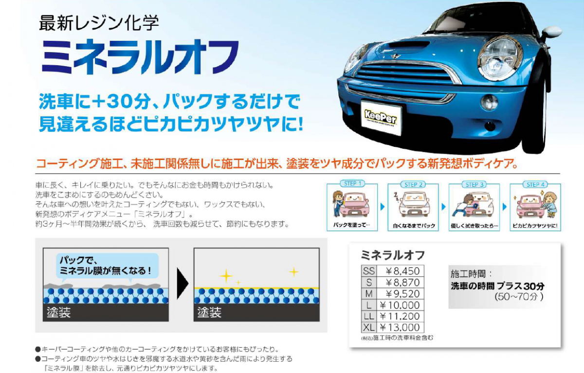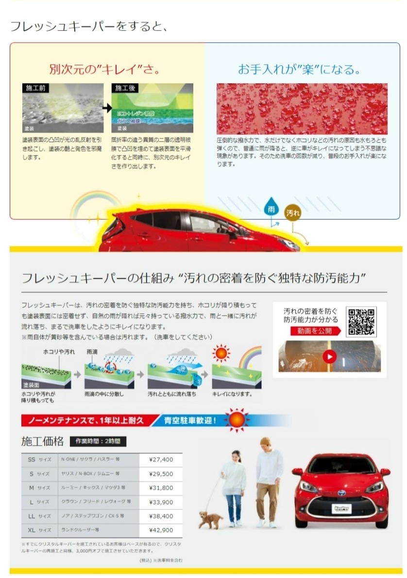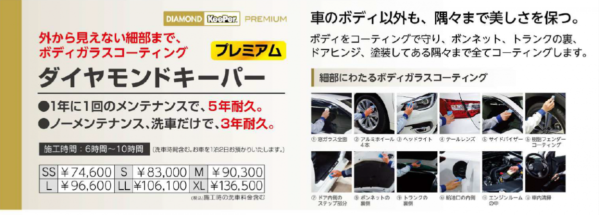 より深いツヤと輝きを実現!! 厚いガラスの層がたっぷり2倍あることで『ツヤ』や、防汚能力も強化された被膜を形成します。 お車をご購入されたばかりの方に圧倒的に支持されております♪♪ 施工時間:1日〜2日お車をお預かりします