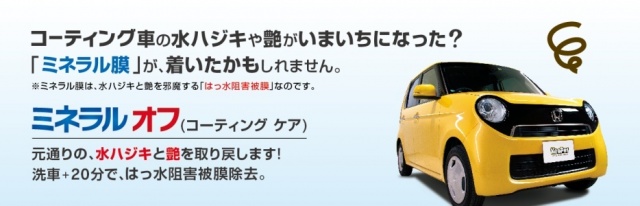●ガラスコーティングの被膜自体を手入れするのではないので 「メンテナンス」ではありません。被膜の上に着いたミネラル膜だけを取り去ってキレイにするので「ミネラル オフ」と言います。