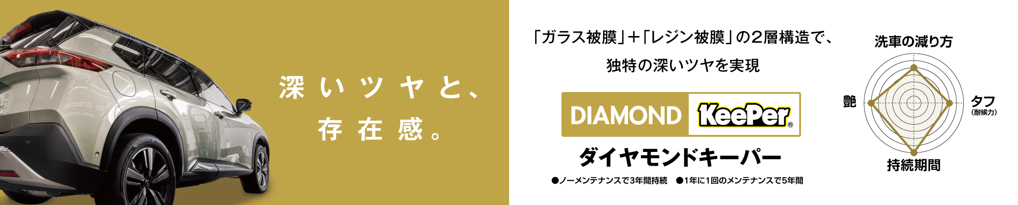 耐久期間 3年間 ノーメンテナンス、洗車だけ。(2年に1回のメンテナンスで6年耐久) ツヤ 8ツ星 ★★★★★★★★☆☆ 汚れにくさ 7ツ星 ★★★★★★★☆☆☆ 水はじき 強撥水 強い水はじき、水玉になります。 施工時間 6時間~12時間(メンテナンスは2時間~) 高密度プライマーガラス+ ファンデルワールス力の最小化・新「ダイヤⅡレジン」 KeePerの原点“ダイヤモンドキーパー”が、新しい輝きとコスパで