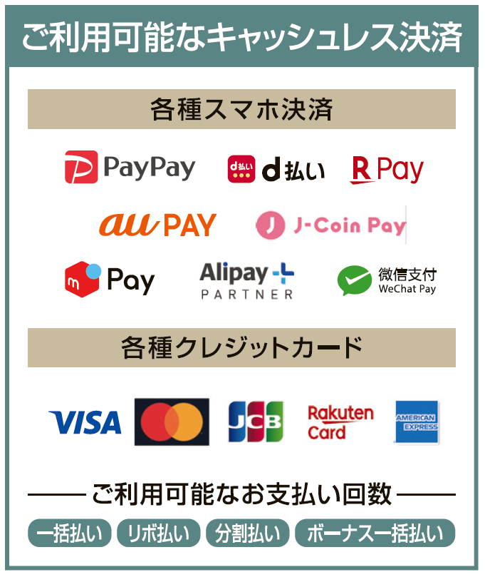 お支払いは現金または各種クレジットカード、d払い・paypay・楽天ペイ・aupay等のキャッシュレス決済がご利用頂けます。