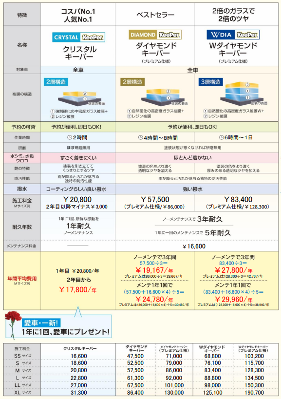 当店ではキーパーコーティングのメニューを多数取り揃えております。