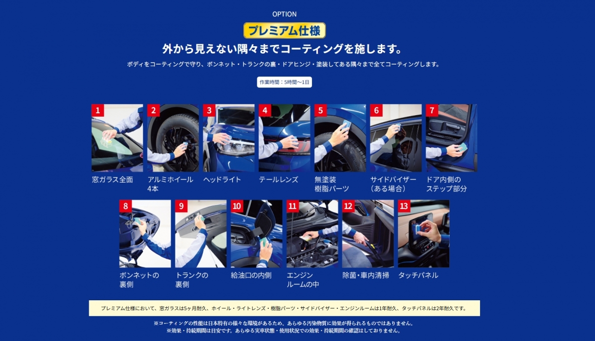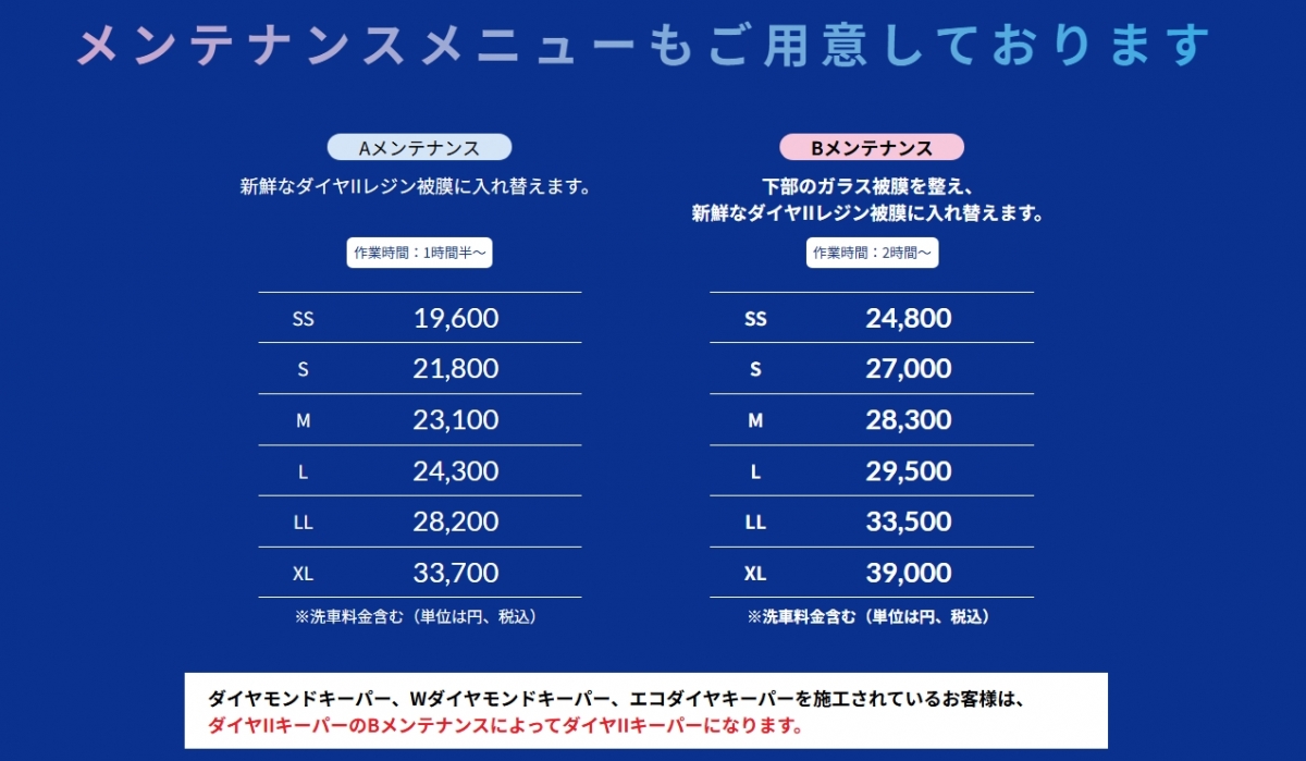 Q コ-ティングをするのに予約はいるの? A 予約をしていただかなくても構いません。 ダイヤモンドキーパー・クリスタルキーパーは作業時間がかかりますので、ご予約をおすすめします。予約していただけると作業がスムーズに行えますのでお客様をお待たせすることなく施工することができます。