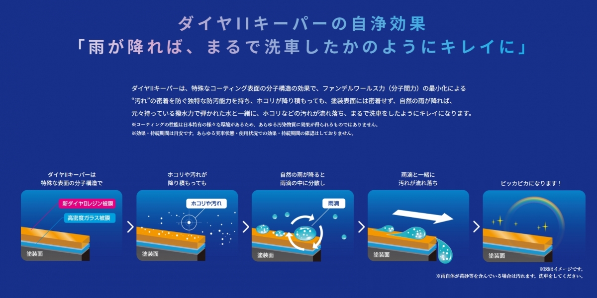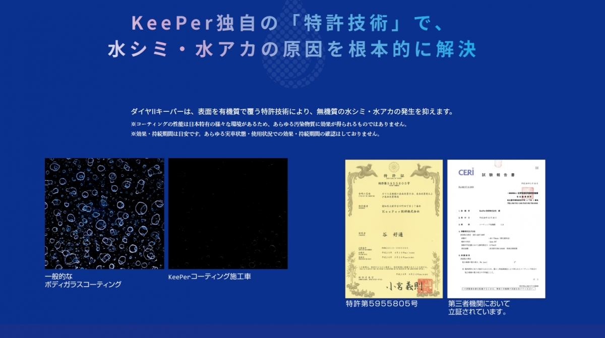 キーパーコーティングは、非常に細かい分子でコーティングを定着させていきます。 例えば、塗りたての塗装でも、通気性に優れておりますので塗装の乾燥過程に出てくるガスも、コーティングした後でもキレイに抜けていきます。 多くのガラスコーティングに入っているキレシンなどの『有機溶剤』を使わないため塗装に優しく、侵食してしまうことはありませんのでご安心してお任せ下さい。