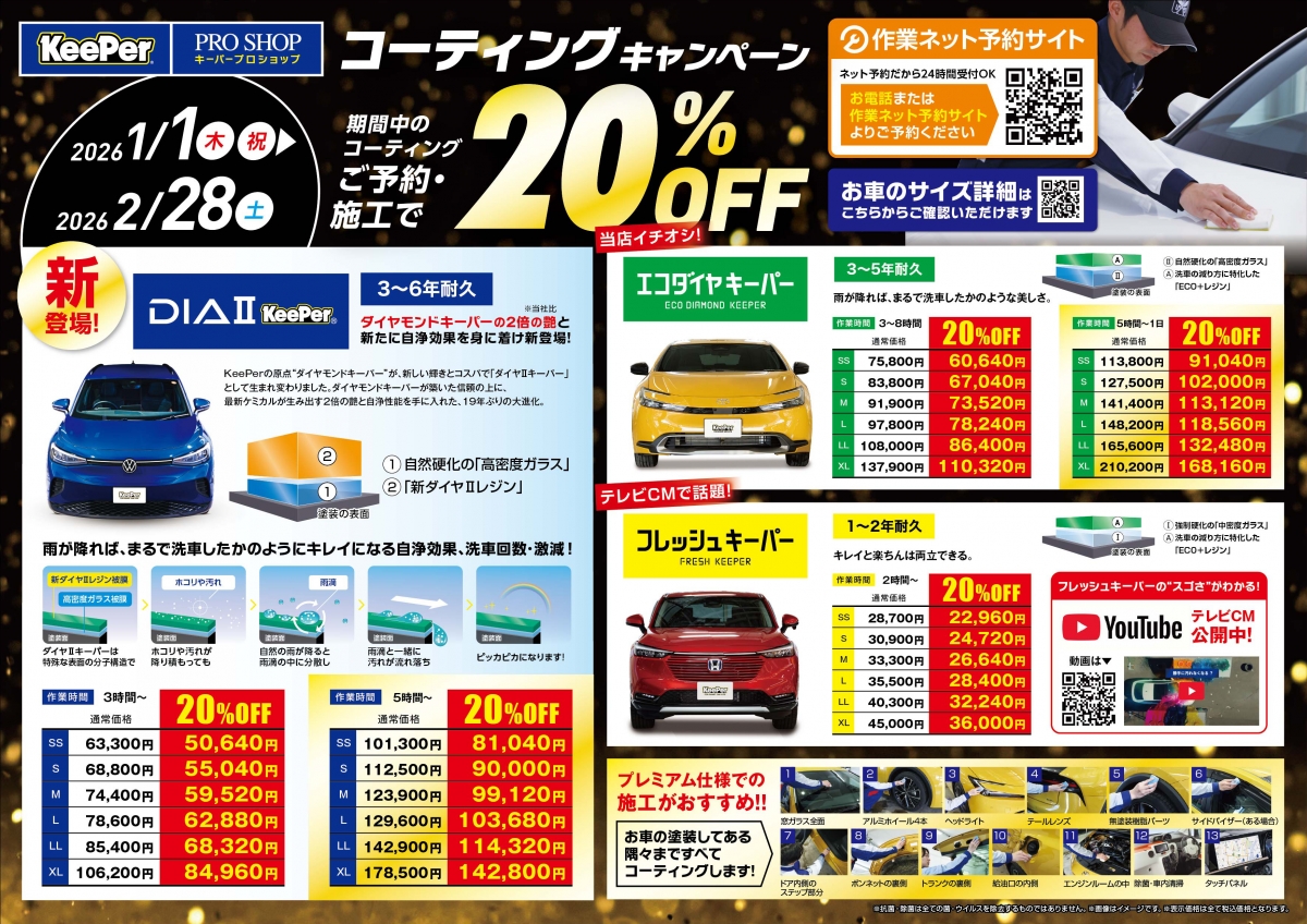 コーティングキャンペーン!! 期間中の、ご予約・施工で 対象のコーティングが20%OFF!
