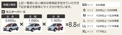 当店では料金を公平に保つ為に『現行型』の体積(全長×全幅×全高)を基準に、形状を考慮したうえでサイズ分けを行っています。