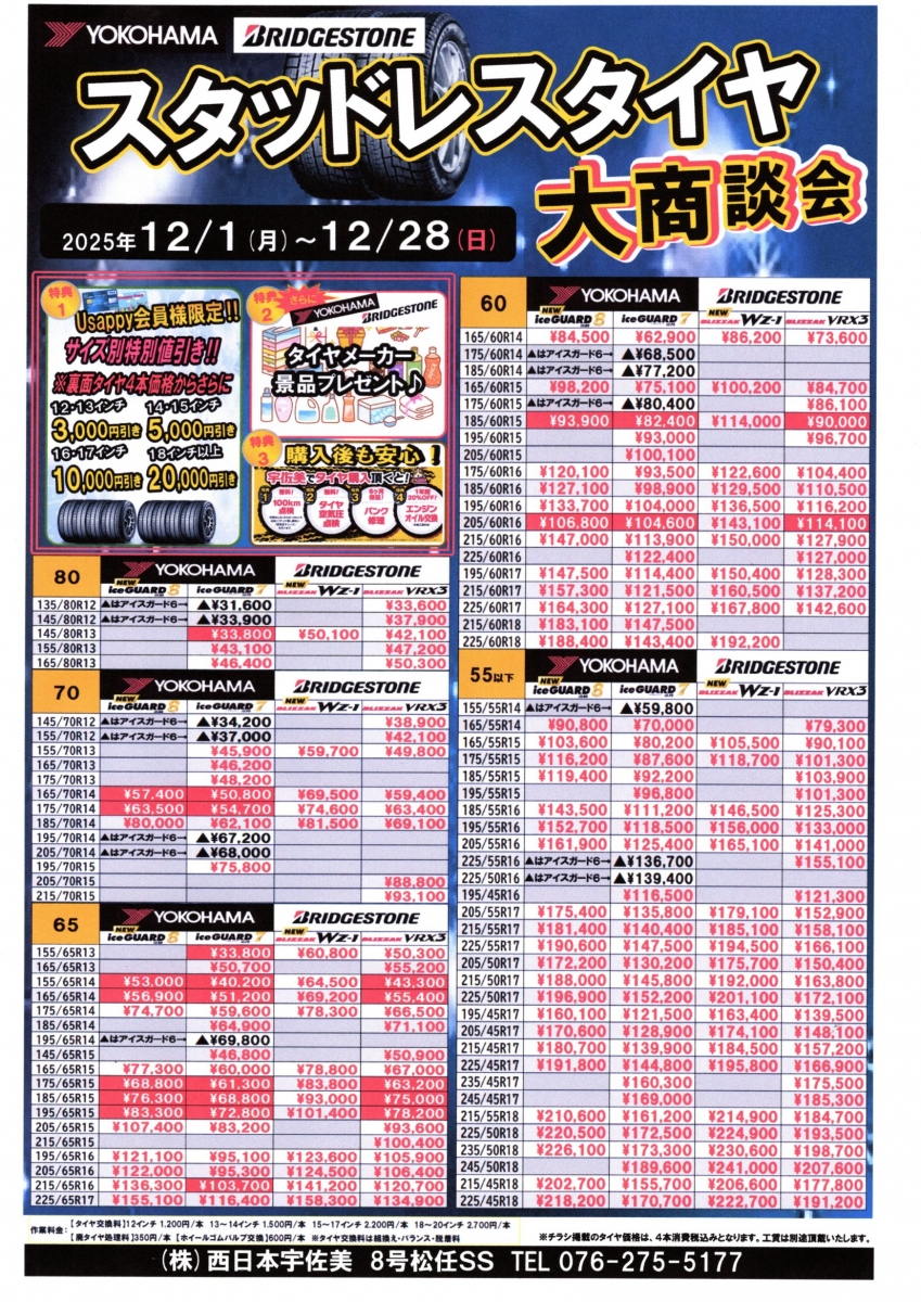 15.16.17インチ 通常価格 4,800円/台(税込)⇒2,500円/(税込)
