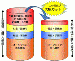 オークションから直接買い付けることで中間マージンをカットし、さらに人件費・広告費・在庫管理費等もカットすることで ありえない値段でお車を提供できます。