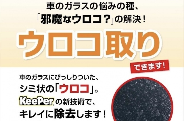 「窓ガラスの”ウロコ”取り」は、KeePerの新技術により、お車の窓ガラスを傷めることなく、ウロコをキレイに除去します。専用ケミカルと道具を使って、じっくり磨くことで、お車の窓ガラスを傷つけることなく、確実にウロコを除去していきます。