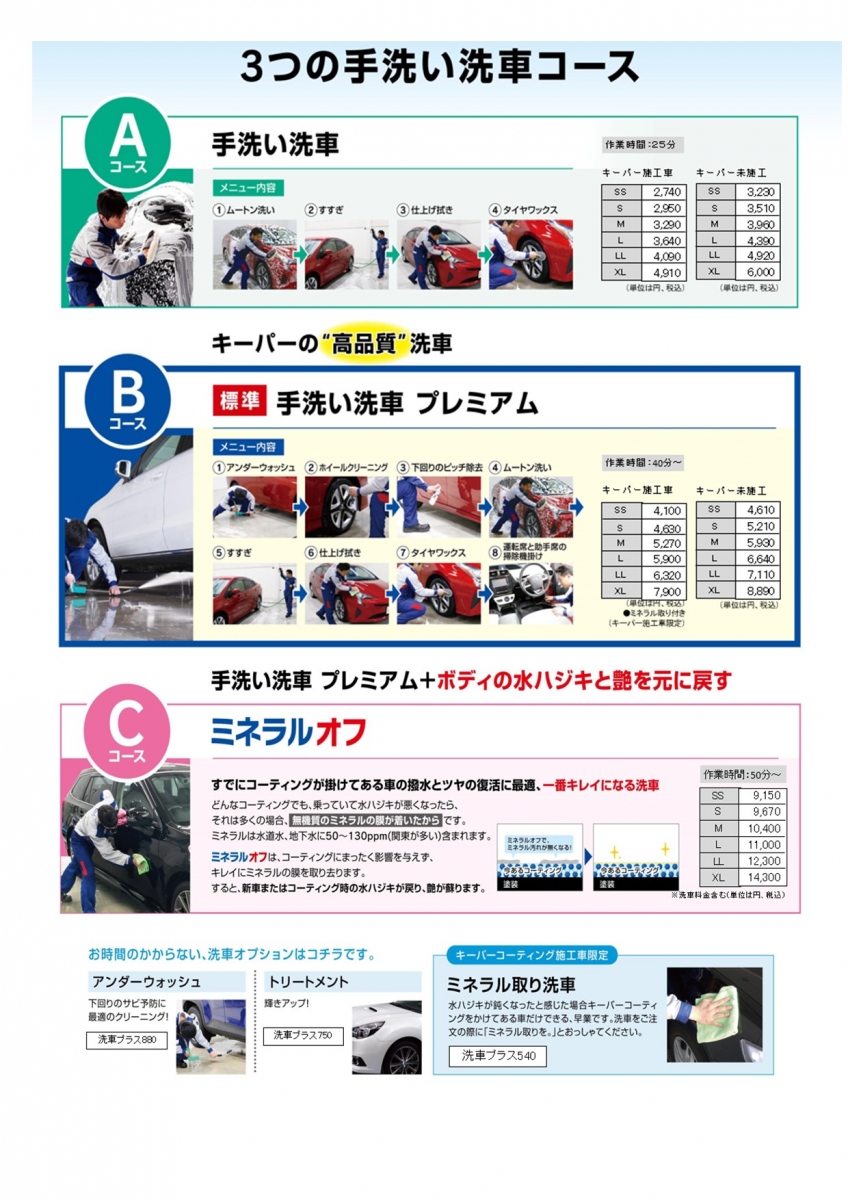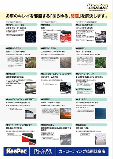 A.事故などで板金塗装をした際、保険会社に提示していただくと、保険対応にて部分施工などができます! 他にも、キーパーコーティングや普段のお手入れ方法が記載されています。Q.確認洗車って何するの?